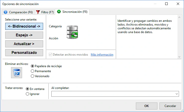 - Bidireccional: busca cambios en tanto en el lado izquierdo como del derecho y hace la sincronización en el otro lado.