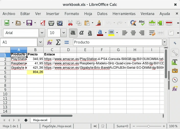 LibreOffice tiene la capacidad de abrir documentos excel, en la siguiente imagen se ve el documento abierto con LibreOffice Calc creado en el ejemplo.