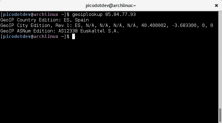 En Arch Linux al igual que en muchas otras distribuciones GNU/Linux hay unos comandos y unos paquetes que contienen una base de datos que en base a la dirección IP proporciona el país, ciudad, código postal y coordenadas geográficas de latitud y longitud, son geoip con información del país y geoip-database-extra para obtener información de la ciudad. La localización de un usuario también puede obtenerse usando una consulta que implique red de datos hacia algún servicio y si el usuario en su navegador lo permite proporcionar la información de su geoposicionamiento, la diferencia es que la petición que haga uso de red añade algo de latencia a la respuesta de la aplicación tampoco requieren pedir permisos al usuario para activar su geoposicionamiento. La información proporcionada por geoip quizá no sea tan exacta en todos los casos que los anteriores métodos pero más que suficiente en la mayoría. En caso de querer la mejor precisión se puede optar primeramente pedir al usuario que comparta su localizacion mediante el navegador, luego o en la primera petición hasta que el usuario comparta su posición por usar la base de datos de geoip, si esta no es exacta aunque seguramente proporcione al menos el país pero no proporciona la ciudad se puede optar por usar algún servicio que implique red.
