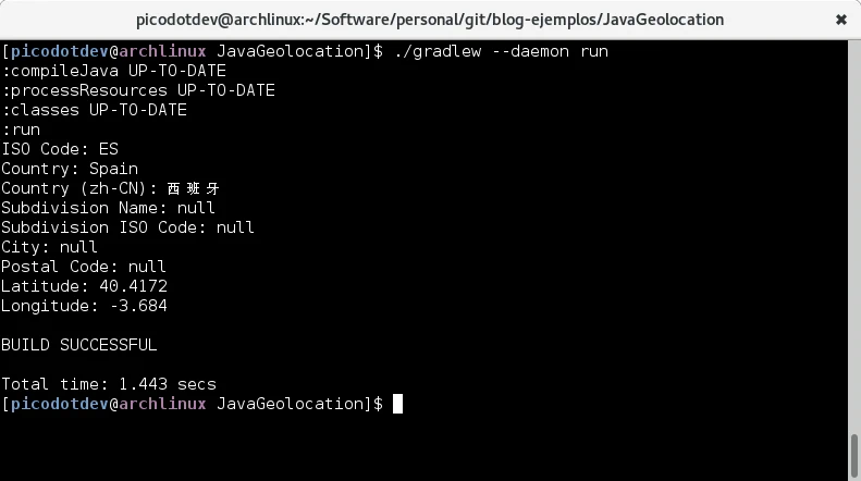 Otra opción es usar otra base de datos de geolocalización para direcciones IP, en vez de instalar un paquete en el sistema y usar el comando geoiplookup y procesar su salida con las bases de datos de MaxMind GeoLite2 para paises y ciudades dispondremos de una API accessible desde el lenguaje de programación que prefiramos. En este ejemplo usaré Java pero hay bindings para los lenguajes más populares.