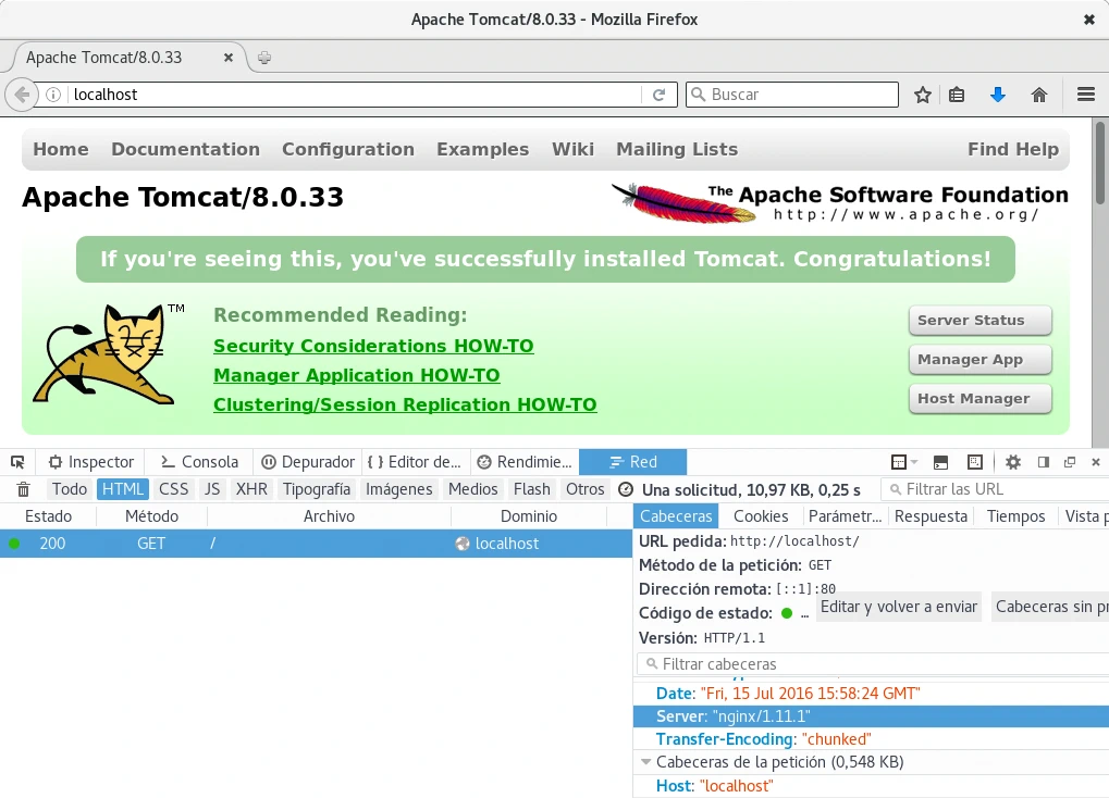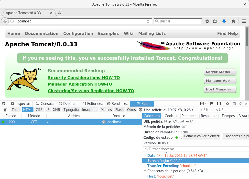 Arrancado los contenedores con el comando docker-compose up accediendo al servidor web veremos que el contenido proporcionado es el ofrecido por Tomcat, que con la configuración del ejemplo es la página de inicio de Tomcat. En las cabeceras de respuesta Nginx añade una, Server, indicando su versión.