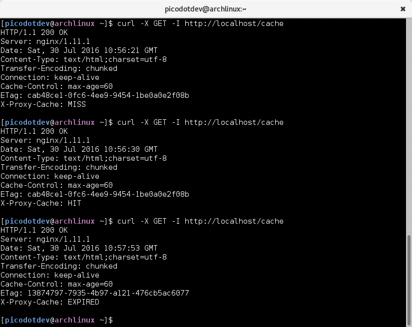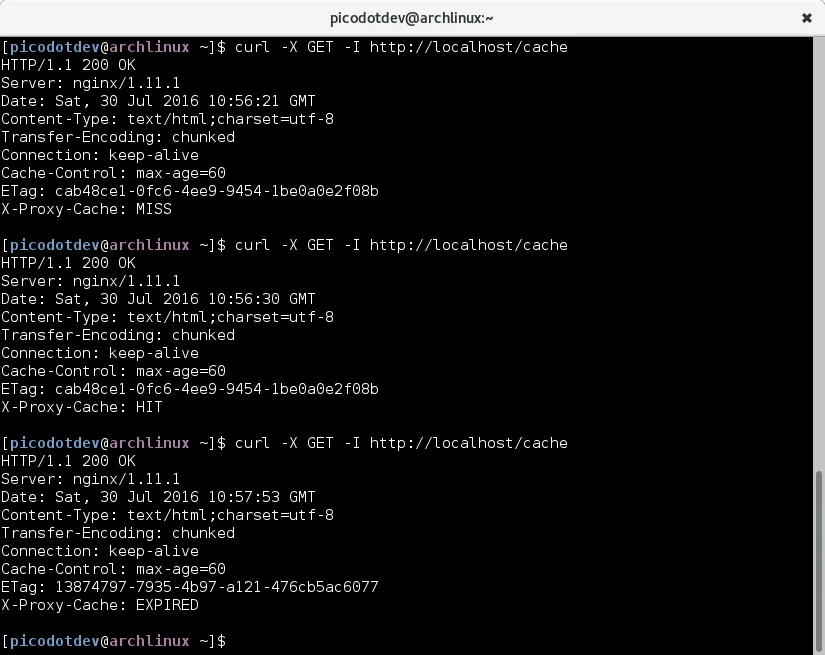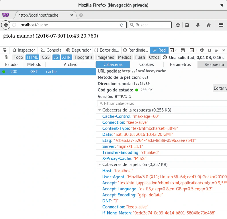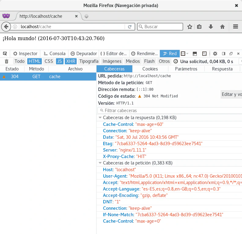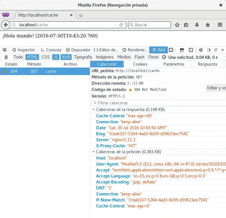 La primera petición que se realiza al recurso cache devuelve un código de estado 200 de HTTP y Nginx en la cabecera X-Proxy-Cache indica que se ha producido un MISS o fallo en la cache, la segunda petición realizada antes de que pase el minuto del tiempo de expiración devuelve un código de estado 304 y Nginx en la cabecera X-Proxy-Cache un HIT o acierto en la cache, finalmente pasado más de un minuto del tiempo de expiración se devuelve un código de estado 200 y Nginx en la cabecera X-Proxy-Cache un EXPIRED. En las trazas de Nginx vemos las peticiones que se producen sus códigos de estado y después de este los bytes transferidos de contenido, nótese que en los casos de los 304 los bytes transferidos son 0, bytes de datos ahorrados y evitado que la petición llegue a la aplicación que son unos de los objetivos de las caches. En el recurso nocache de la aplicación Nginx no cachea el contenido devuelto ya que en este no se establecen las cabeceras de cache en la respuesta.