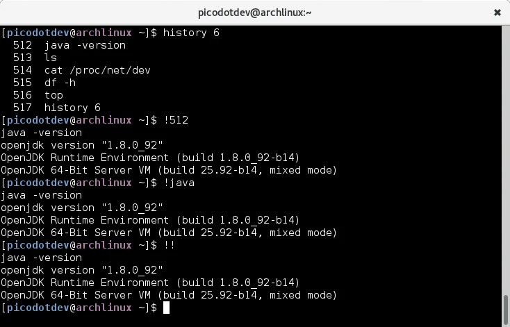 Con el comando history podemos ver el historial completo de comandos que hemos ejecutado con anterioridad. Al lado de cada comando vemos un identificador numérico que podemos usar para ejecutarlo de nuevo con ![identificador]. Con el siguiente historial podemos ejecutar el comando con identificador 512 indicando una exclamación y el identificador, !512. Si queremos ejecutar el último comando introducido podemos usar la doble exclamación !!. Si queremos ejecutar el último comando completo de cierto comando podemos usar ![comando] en vez de su identificador.