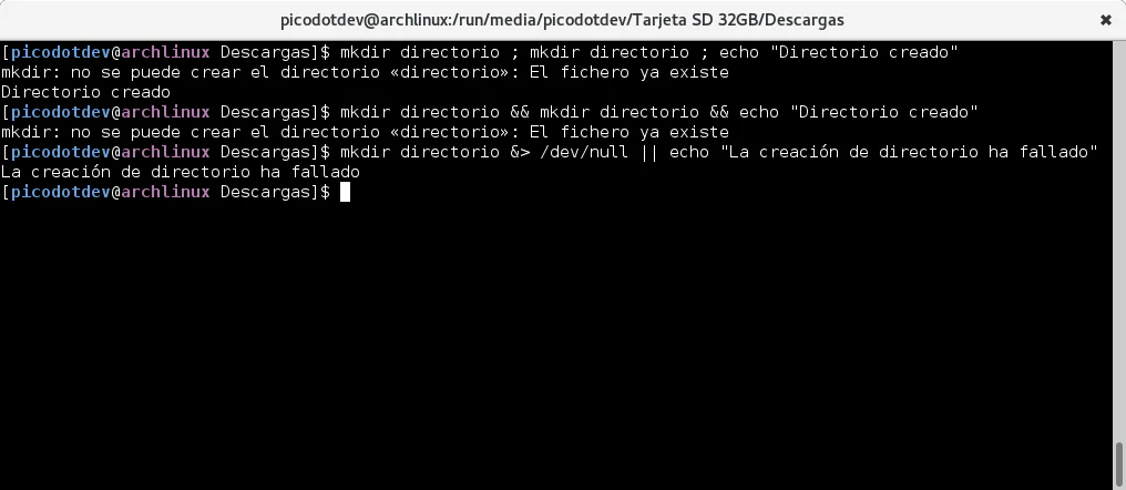 Si necesitamos ejecutar dos comandos seguidos podemos introducirlos en la misma línea en vez de individualmente, ejecutar un comando si el anterior se ha ejecutado correctamente con && o al contrario ejecutar un comando si el anterior ha fallado con ||. Si en la ubicación de trabajo que estamos existe un directorio no se podrá crear otro con el mismo nombre, dependiendo de las opciones de encadenamiento según el resultado del comando anterior se ejecutará o no el siguiente comando.