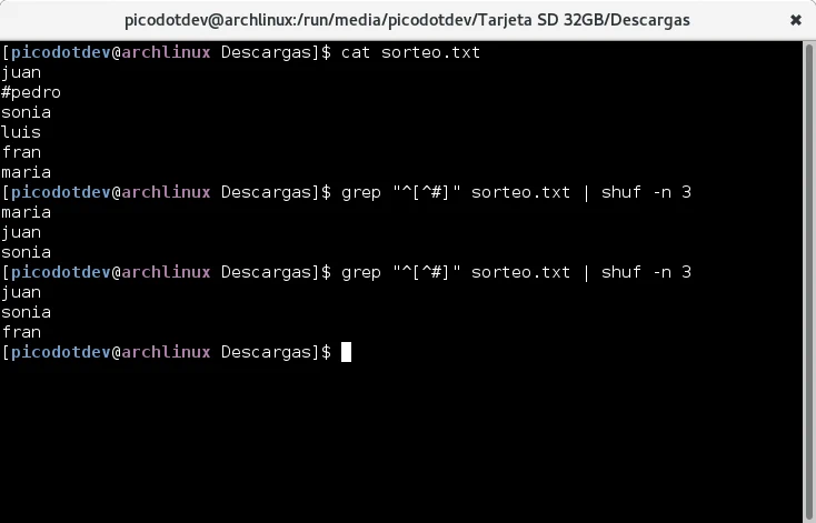 Por ejemplo, dada una lista de concursantes habilitados en un sorteo podemos obtener 3 ganadores de forma aleatoria con la combinación de los siguientes comandos. El comando grep permite aplicar una expresión regular a cada línea de un fichero que si la cumple es enviada a la salida, shuf reordena las líneas de forma aleatoria y con la opción -n 3 emite las 3 primeras. Los comandos proporcionados por GNU en los sistemas Linux proporcionan multitud de comandos como estos muy útiles, combinándolos conseguimos tareas más capaces que lo que son los comandos individualmente.