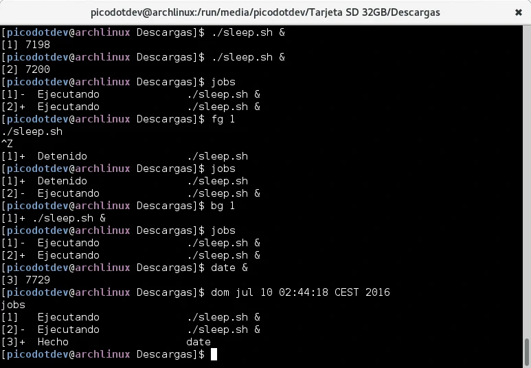 El comando jobs obtenemos una lista de trabajos que se está ejecutando junto con su identificador y estado, con la combinación de teclas Ctrl+z dejamos el proceso actual detenido y en segundo plano, con fg lo devolvemos a primer plano y si estaba detenido se continua su ejecución, con bg si estaba detenido continua su ejecución en segundo plano.