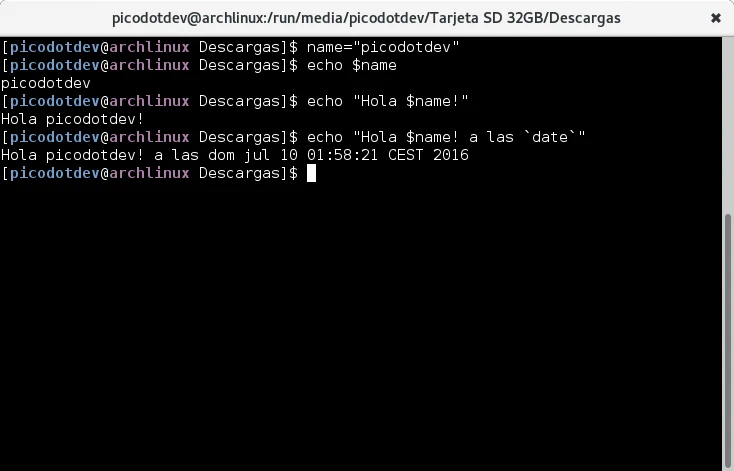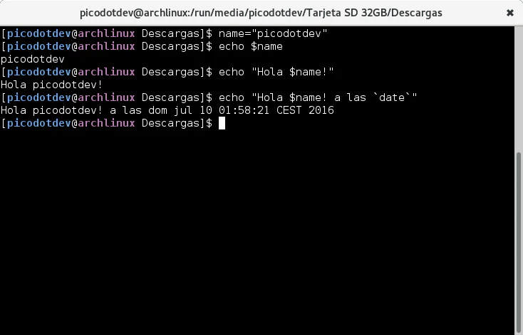 Podemos definir variables locales en el script o exportarlas para que estén accesibles en otros procesos e incluso interpolarlas en cadenas de la siguiente forma: