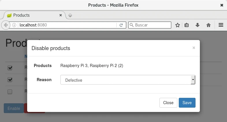 En la necesidad real las filas son compras pero en el ejemplo usaré la entidad Product. Las acciones en el ejemplo serán habilitar para la que no será necesaria información adicional, la otra acción será deshabilitar para la que se necesitará introducir una razón con un modal.