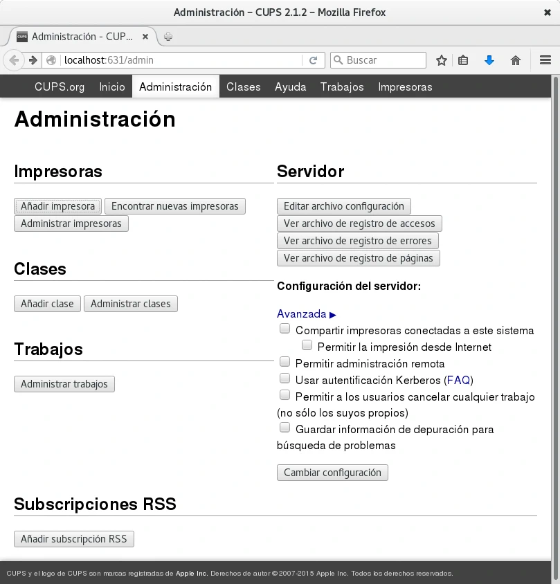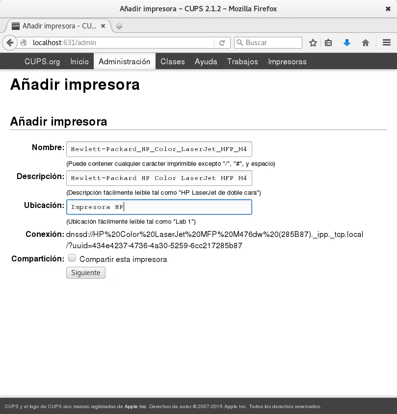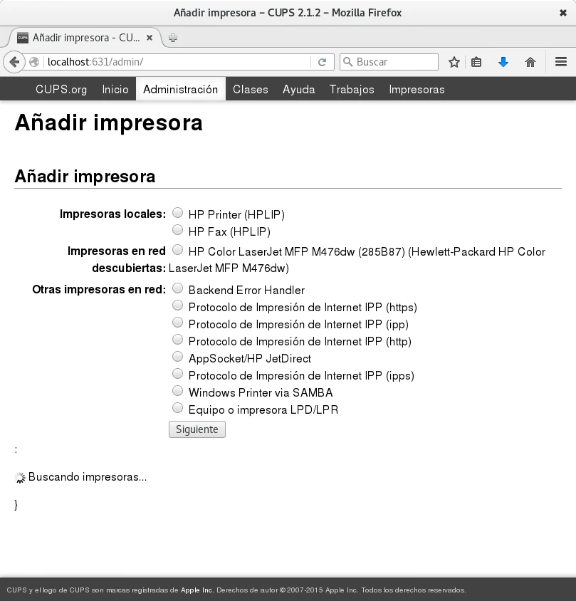 CUPS posee un panel de administración accesible con el navegador en la dirección http://localhost:631/admin. Pulsando el botón Añadir impresora en el panel de administración de CUPS iniciamos el asistente para añadir la impresora en el que avahi nos detectará la impresora en red y deberemos seleccionar la marca junto con el modelo específico. Al añadir la impresora se nos preguntará por un usuario y contraseña, como nombre usuario deberemos introducir root y como contraseña la que hayamos establecido en el sistema para el superusuario. Desde el panel de impresoras de GNOME se debería poder añadir la impresora, sin embargo, a mi me daba algún tipo de error de modo que lo hice desde CUPS.
