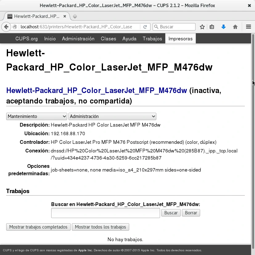 Uso Arch Linux desde hace ya más de un lustro, en mi equipo personal e incluso en el equipo del trabajo. Hasta hace poco cuando necesitaba imprimir llevaba el documento en formato PDF en una memoria USB a una copistería y allí los imprimía dado que no tenía configurado mi equipo para usar la impresora en red, más que nada porque no le había dedicado de tiempo para hacerlo. Por último, encontré un momento y realice la configuración de un impresora en red Hewlett Packard Color LaserJet MFP M476dw con CUPS en Arch Linux no sin encontrarme con algunos algunos problemas que finalmente conseguí resolver.