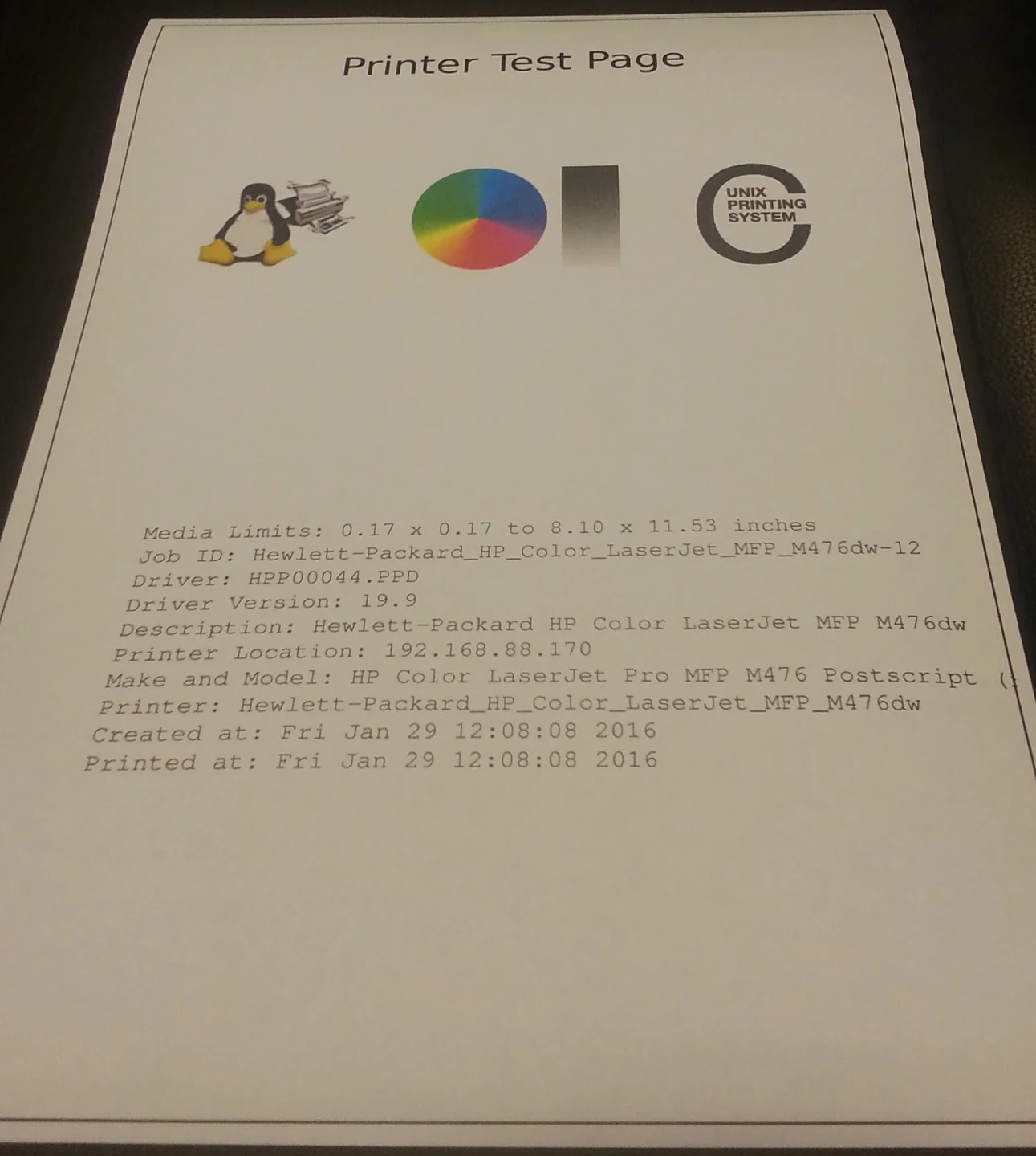 Con todo configurado la prueba de impresión realizable tanto desde la página de administración de CUPS como de GNOME se realizó correctamente y este es el resultado. Una vez que esta prueba es satisfactoria podemos imprimir documentos desde las aplicaciones usando el diálogo de impresión donde aparecerá la impresora en red configurada. Además podremos cambiar algunas opciones como imprimir a dos caras o solo a una, imprimir en blanco y negro o a color o usar un perfil de impresión para ahorro de tinta.