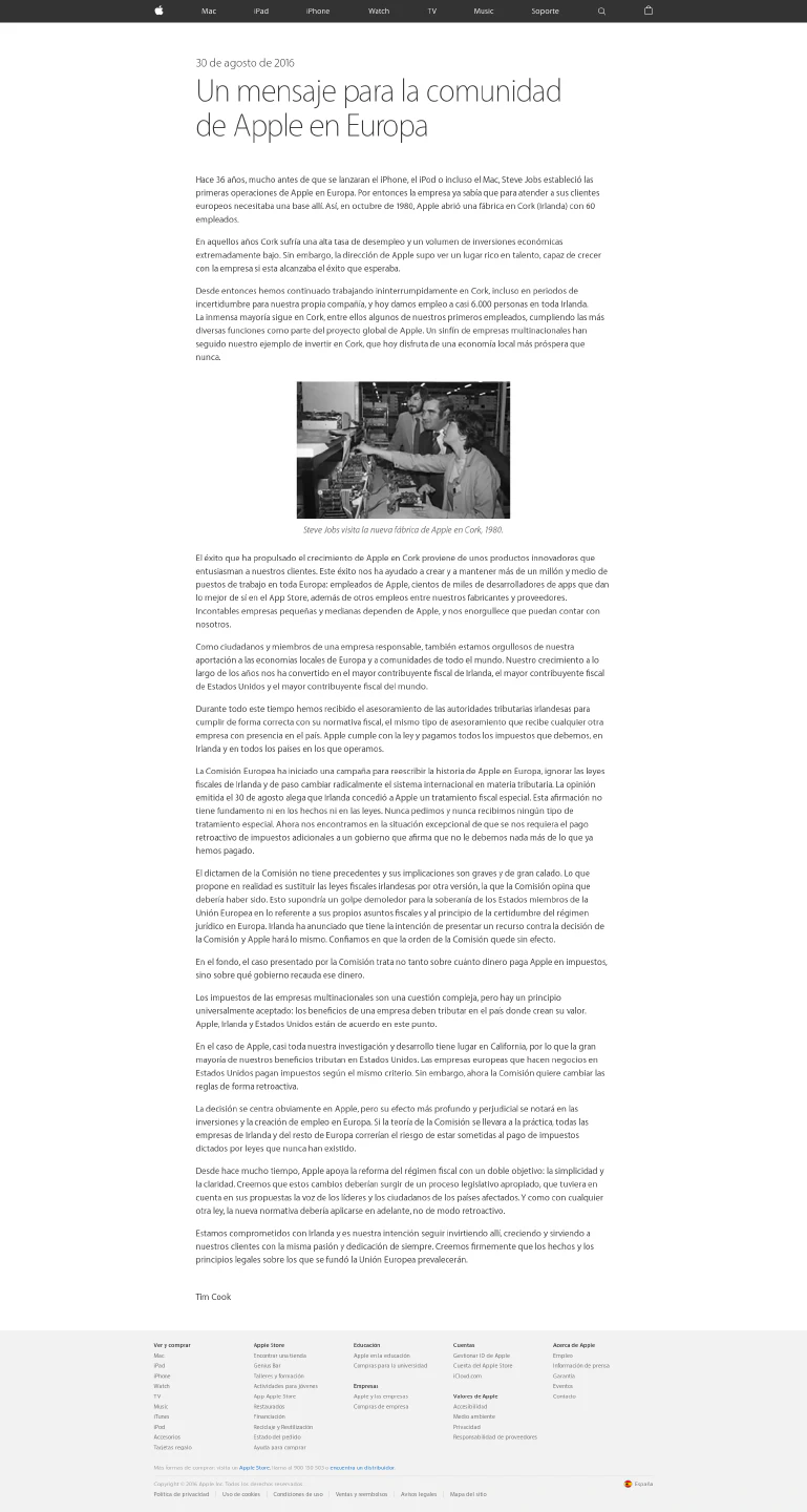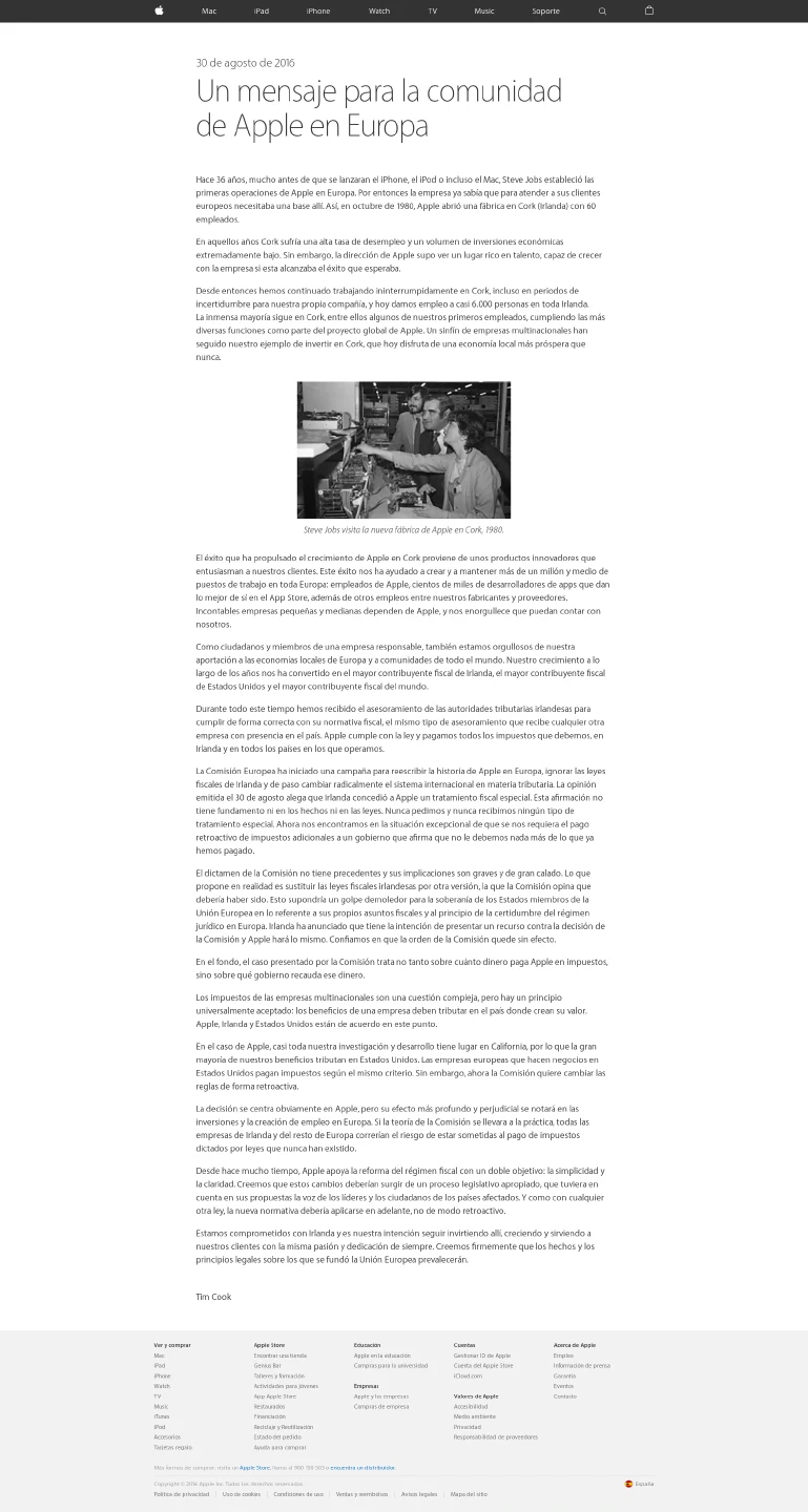 Horas después Apple en su web publicaba una carta firmada por Tim Cook indicando lo mucho que contribuye en empleos e inversiones en Europa que se verán amenazadas además de afirmar que no ha recibido ninguna ventaja fiscal de la que se le acusa.