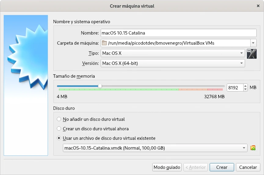 En el caso de Linux el archivo de comandos es similar aunque no es necesario ejecutar los comandos con permiso de administrador. Igualmente hay que sustituir macOS 10.15 Catalina por el nombre que le hayamos dado a la máquina virtual al crearla.