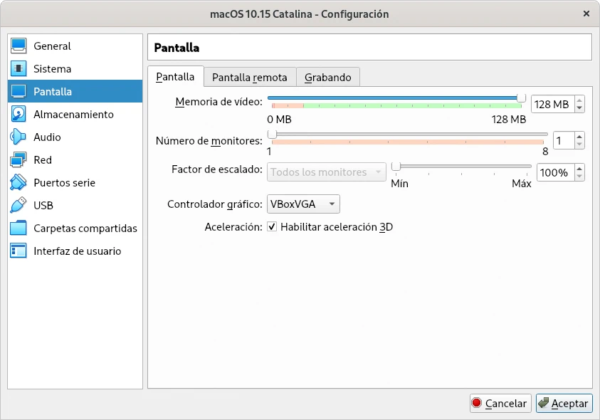 Dado que al virtualizar se están ejecutando dos sistemas operativos a la vez los requerimientos de la computadora anfitrión donde se ejecutan ambos son más elevados en cuando a memoria y almacenamiento siendo recomendable tener al menos 8 GiB de memoria, asignando 4 GiB a la máquina virtual y 25 GiB de almacenamiento. Para probar macOS Catalina en VirtualBox es necesario asignar a la máquina virtual 8 GiB de modo que es necesario tener en el sistema al menos 16 GiB.