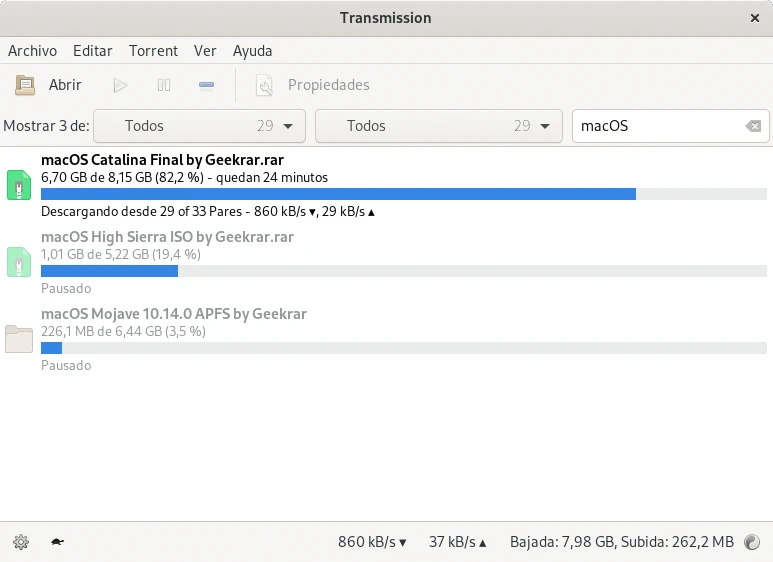 Los archivos torrent permiten descargar las imágenes de instalación de macOS que ocupan entre 5 y 10 GiB mediante compartición de archivos entre usuarios torrent con programas como Transmission o uTorrent. Dependiendo de la velocidad de conexión a internet la descarga tarda más o menos.