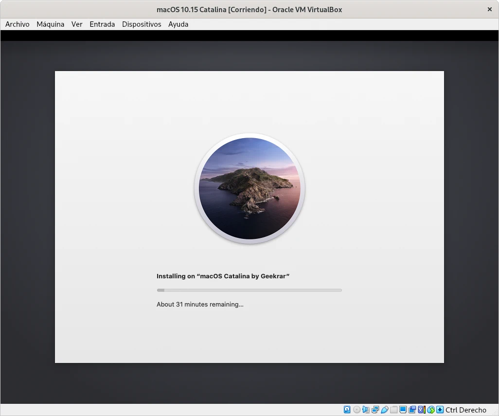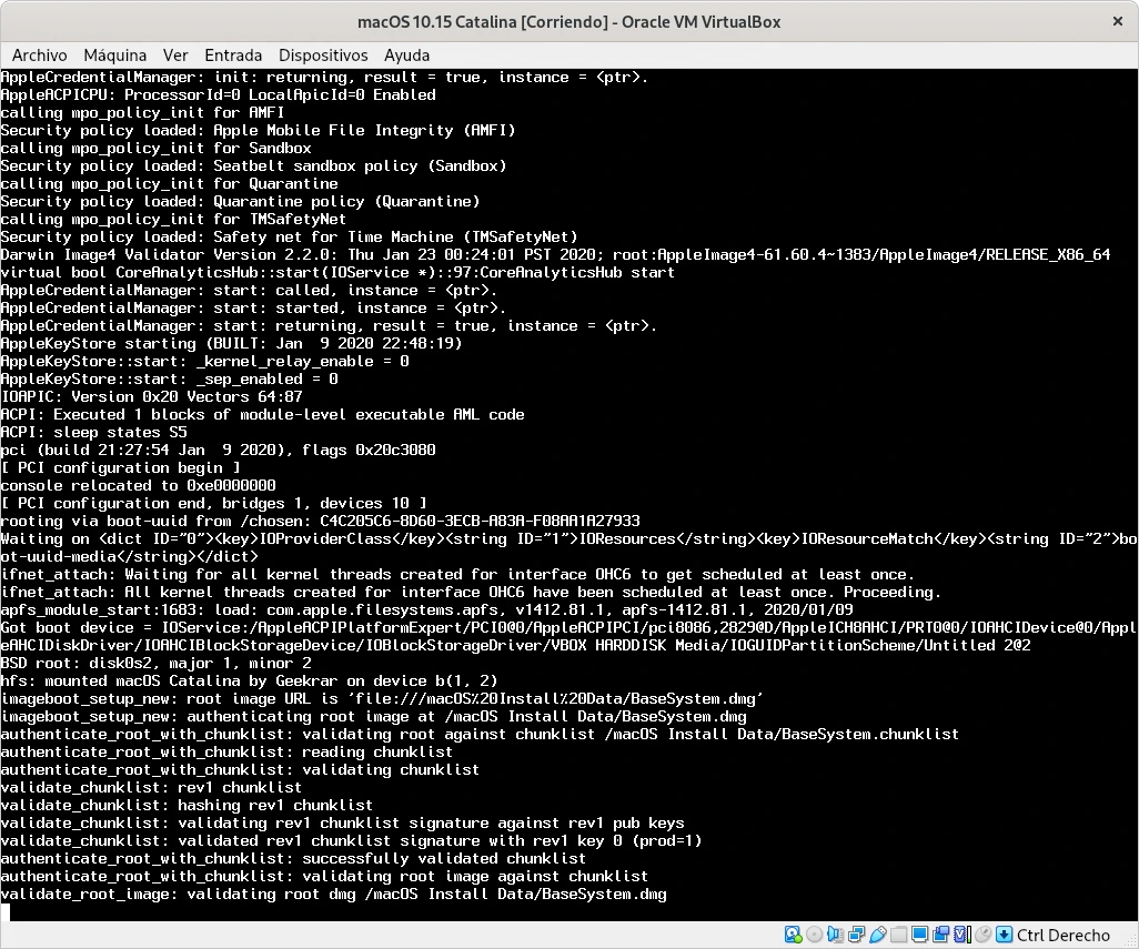 Al iniciar la ejecución de la máquina virtual de macOS en los primeros segundos empiezan a salir unos cuantos mensajes en modo texto hasta que se inicia el sistema gráfico con un proceso que inicia la instalación que tarda varios minutos pudiendo llegar a más de la media hora.