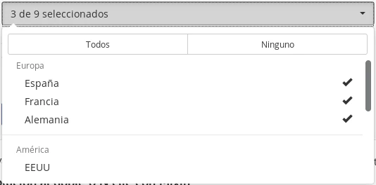 A pesar de todas las opciones adicionales que añade bootstrap-select incluidas los botones de seleccionar todas las opciones y ninguna aún quizá queramos personalizar más el comportamiento, por ejemplo, permitir seleccionar con botones adicionales un grupo de opciones relacionadas. Supongamos que tenemos un componente de selección múltiple de países y queremos seleccionar los países de Europa, América o Asia además de las opciones que bootstrap-select de todos y ninguno.