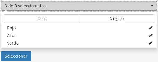 Este sería el aspecto del select múltiple con sus botones para seleccionar todas las opciones y deseleccionar todas, además de personalizados los textos y una pequeña flecha en el desplegable hacia el componente select, todo esto configurado principalmente a través de atributos data y clases CSS.