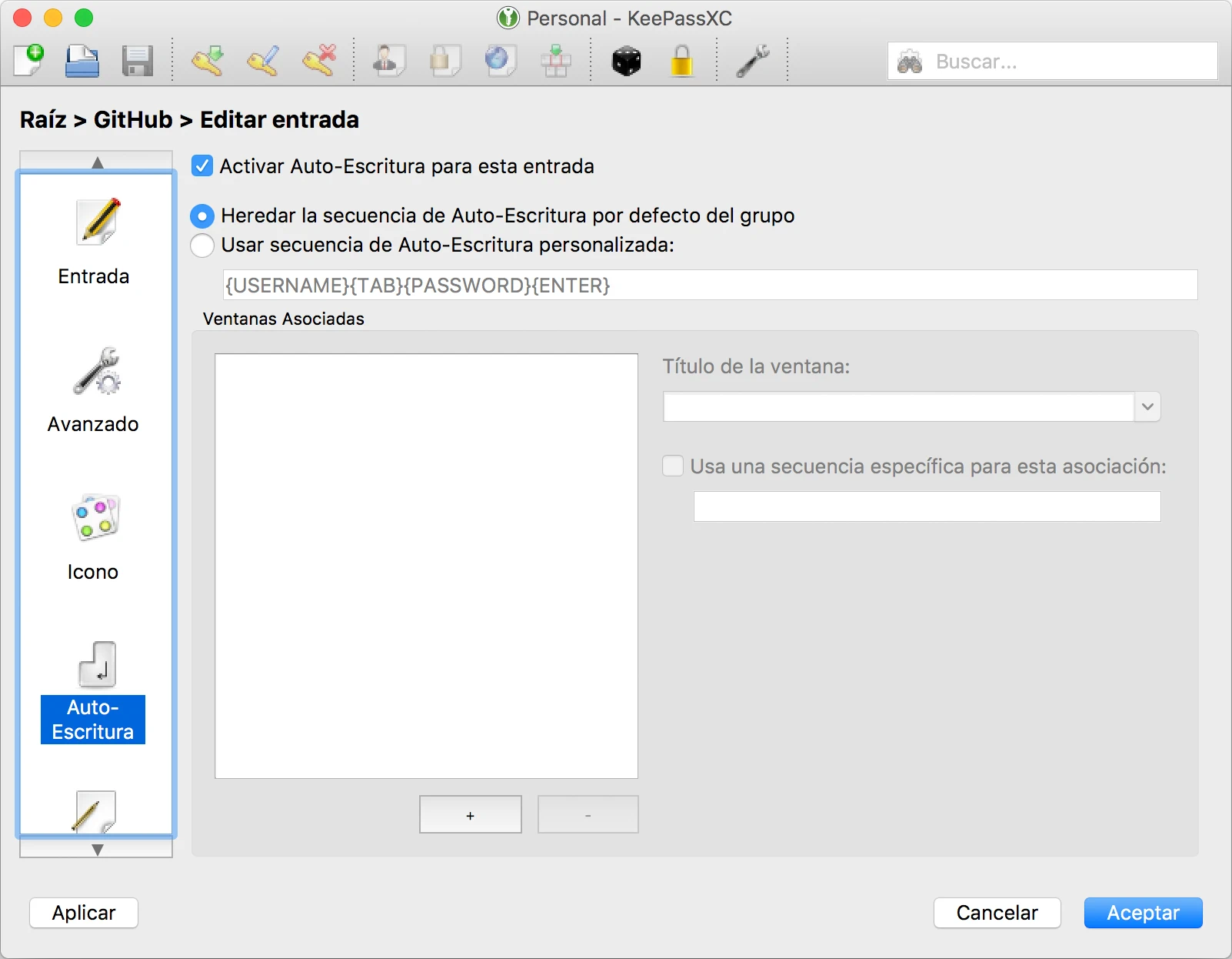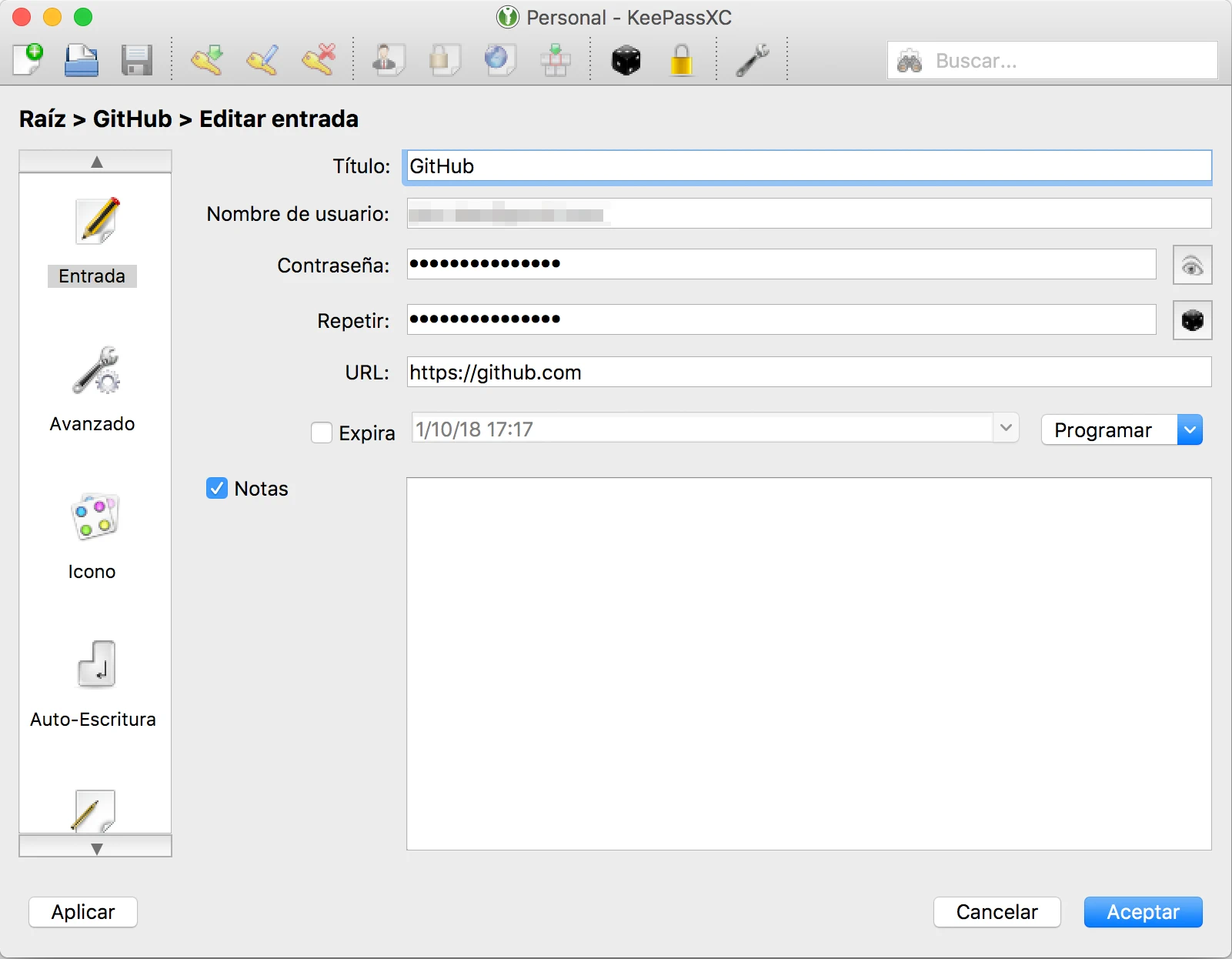 Lo siguiente será crear una entrada con el usuario y contraseña de un servicio.
