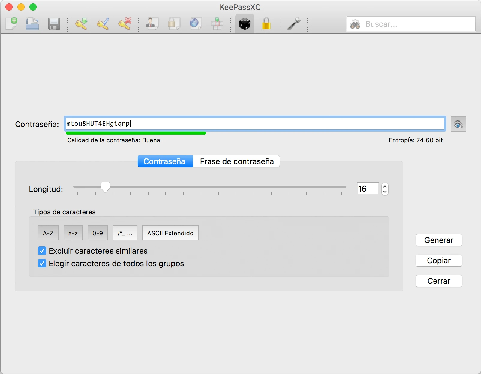 KeePassXC es una herramienta que no tiene más complejidad, podemos asociar alguna información más a la credencial con atributos adicionales y archivos adjuntos pero no es imprescindible. Por supuesto, tiene un generador de contraseñas muy útil con el que obtener contraseñas únicas para cada servicio con las propiedades de seguridad que se requiera en cuanto a longitud, caracteres especiales, mayúsculas, minúsculas y números.