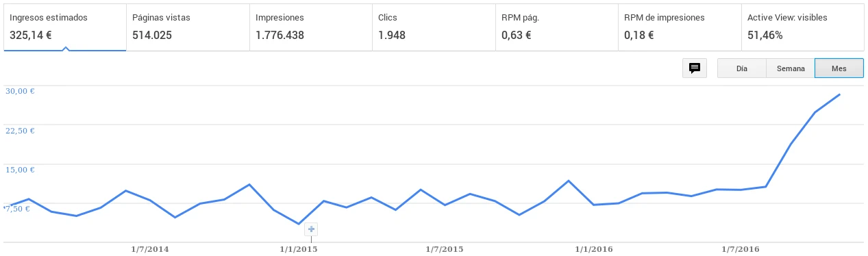 Echando un vistazo a estos seis últimos meses han sido buenos, en número de artículos que he escrito y publicado como en el aumento de número de páginas vistas mensuales con respecto a inicios de 2016 y en similar proporción los ingresos mensuales por publicidad AdSense. De esta forma el esfuerzo en tiempo que supone escribir los artículos me es recompensado de alguna forma.