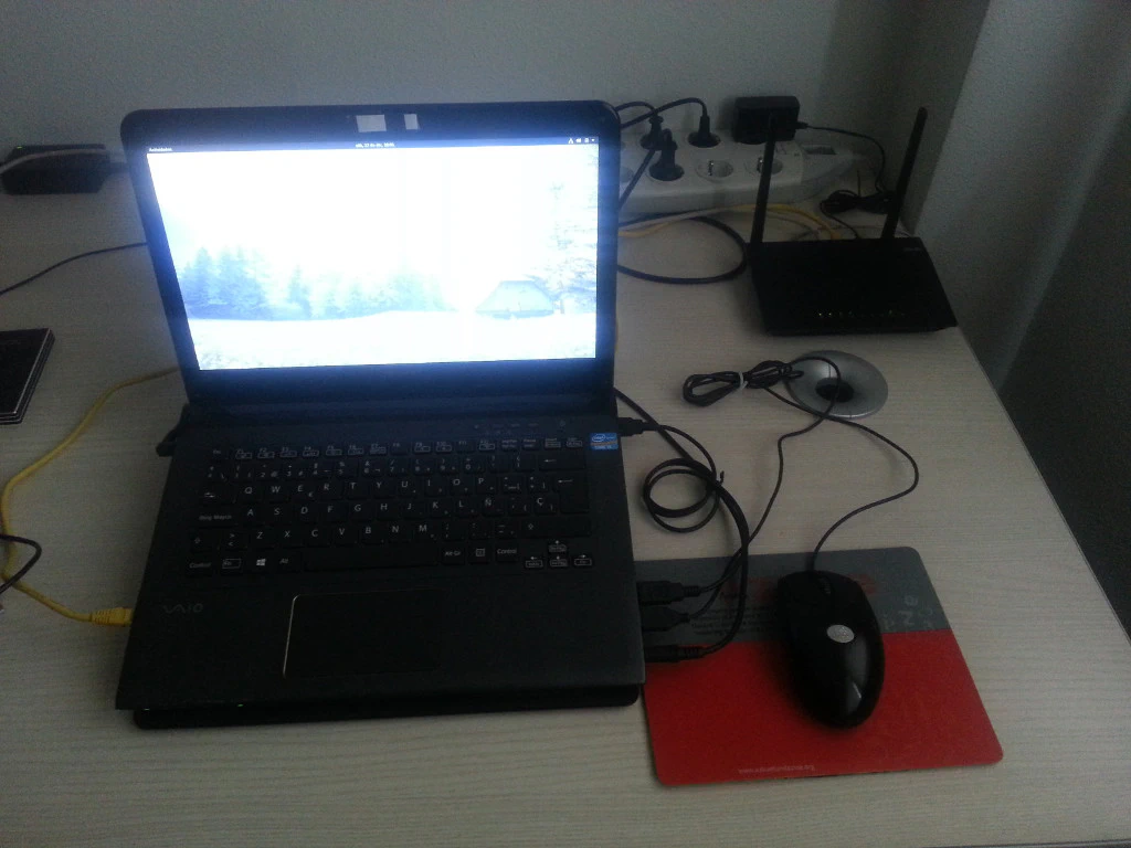 En cuanto a lo que está en la mesa se compone básicamente de un portátil Sony VAIO del que publique su desempaquetado en El blog de pico.dev siendo un procesador Intel Ivy Bridge 3210M, tarjeta gráfica integrada Intel HD 4000, con 8 GiB de memoria y un disco duro SSD Samsung 840 EVO de 250 GiB que le puse posteriormente sustituyendo un disco mecánico que ahora me sirve para hacer copias de seguridad. Aunque el portátil no genera mucho calor al no jugar a juegos lo tengo en una base refrigeradora Zalman que conservo de un portátil Dell anterior del que no quiero acordarme mucho por los pocos años que duró. Junto a ellos un ratón con cable nada especial y la alfombrilla que me regalaron la única vez que fuí a la Euskal Encounter.