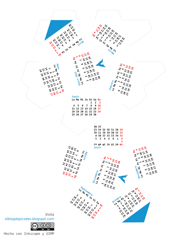También se ven ahí unos altavoces con subwoofer que utilizo para escuchar mi propia música o alguna radio de Jamendo, los tengo arrinconados en una esquina para que ocupen muy poco espacio en la mesa sobre todo los cables. Junto a los altavoces tengo a Tux hecho con papel al igual que un cubo cheatsheet y un dodecaedro con el calendario del año 2012 que no he ido actualizando, muy archeros ellos que decoran un poco la mesa. Y unos bidones de agua que a veces utilizo.