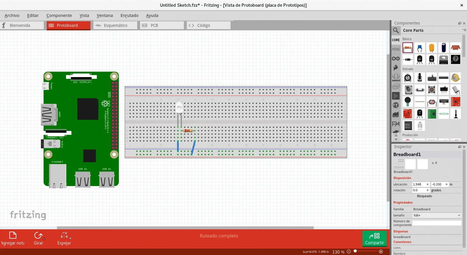 Con el programa Fritzing podremos prototipar y documentar el esquema de conexiones que realicemos de los proyectos. Posee numerosos modelos, elementos electrónicos y dispositivos de entrada y salida aunque no he encontrado el correspondiente la placa de extensión de wiringPi.