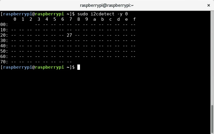 El siguiente paso será activar el bus I2C en la Raspberry Pi que por defecto está desactivado. Esto requiere añadir unos parámetros en la configuración de arranque y cargar unos módulos del kernel que finalmente crearán un dispositivo tal que en /dev/i2c-0 o /dev/i2c-0. Si instalamos el paquete i2c-tools podremos detectar el display en el bus I2C, en la captura de pantalla en la dirección 27 que hay que usar al construir la instancia del controlador del display. Estos cambios en la configuración de inicio requieren reiniciar la Raspberry Pi. En un sistema con la distribución Arch Linux ARM los cambios son los siguientes.