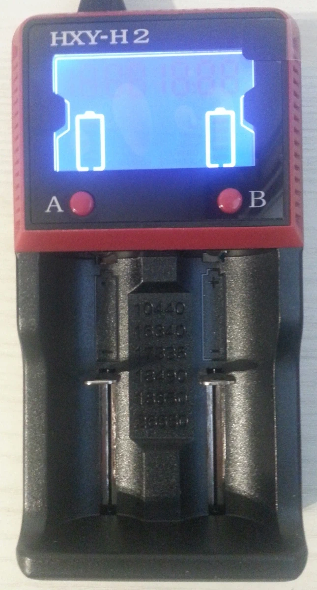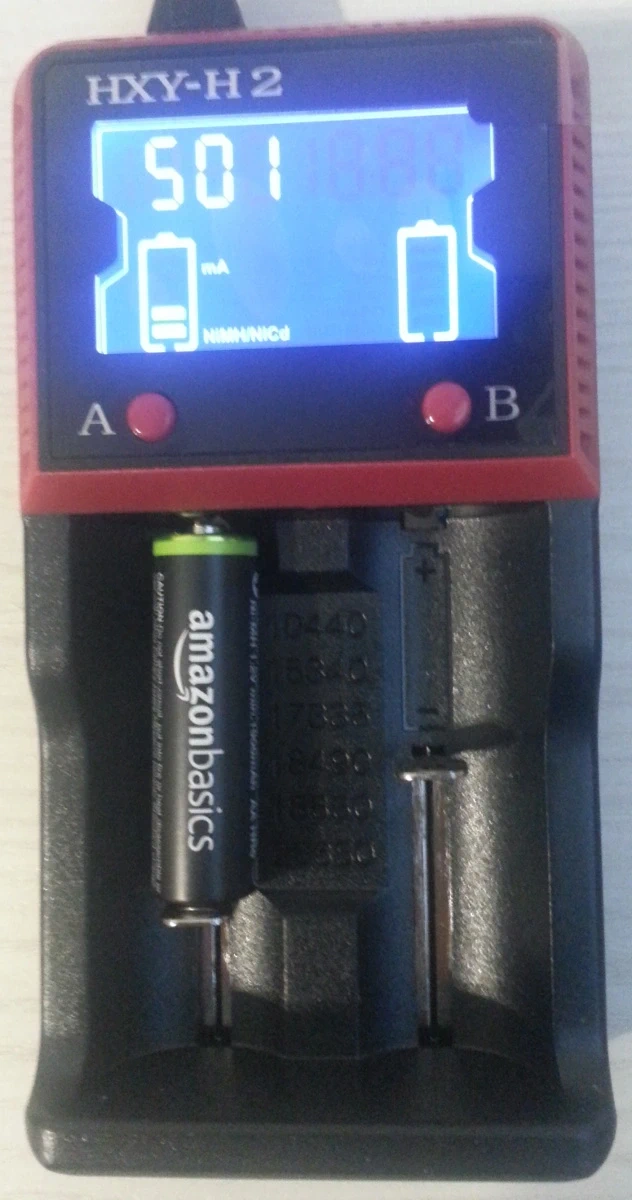 En cuanto al cargador lo que quería era que admitiese al menos pilas del tipo AA, que son las tradicionales, y AAA que son similares pero algo más pequeñas y con algo menos de capacidad. También quería que diese algo de información al menos para saber si estaba completamente cargada. Después de ver casi todos los modelos que hay disponibles en Amazon me decidí por el modelo HXK-H2 para dos pilas con capacidad para cargar dos pilas simultáneamente e independientemente. Me gustó que no es muy caro uno 20 €, cumple con las necesidades básicas que tenía y además de los tipos de pilas AA y AAA Ni-MH y Ni-CD admite otros tipos de pilas como Li-ion, LiFePO. También que admite pilas de diferentes tamaños ya que el cargador se ajusta al maño de la pila. También me gusto que se puede seleccionar si se quieren cargar las pilas con 1000mA o con 500mA que hace la carga más lenta pero hace que las pilas duren más. Tiene un display que muestra un indicador aproximado de la carga de la batería actual, el tipo de batería que detecta automáticamente, el voltaje de carga, el tiempo de carga y la intensidad de la carga seleccionada. La única función que no tiene es la de descargar las pilas antes de cargarlas pero para la mayoría de usuarios es más que suficiente. El material y construcción del cargador da una sensación de buena calidad.