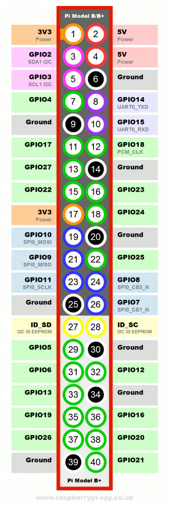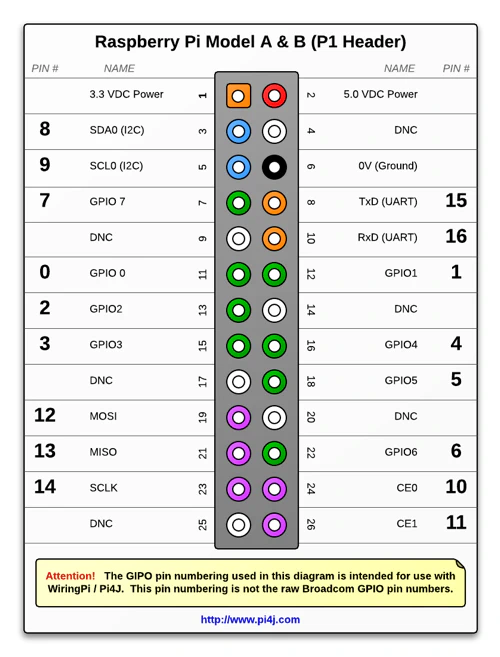 La librería diozeo para identificar los pines usa la nomenclatura de Broadcom, otras son las nomenclaturas del header o de wiringPi. Hay que tener en cuenta la nomenclatura que se use ya que el número del pin variará en cada una de ellas, también hay que tener en cuenta la versión de la Raspberry Pi ya que hay pequeñas variaciones según la versión. Por ejemplo, según la tabla de referencia siguiente, para la Raspberry Pi 1 y según la nomenclatura de Broadcom el pin GPIO 18 corresponde al número 12 de header, el GPIO 21 al número 13 y el GPIO 22 al número 15. Según la nomenclatura de wiringPi el GPIO 1 corresponde al número 1, el GPIO 2 al número 2 y el GPIO 3 al número 3.