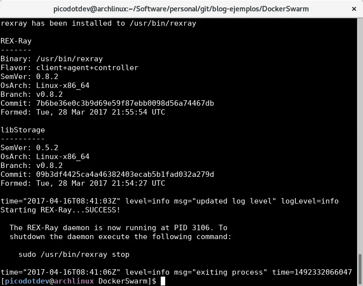Con el cluster creado debemos instalar y configurar REX-Ray en cada uno de los nodos ejecutando varios comandos, un comando instala REX-Ray, otro crea el archivo de configuración en /etc/rexray/config.yml y finalmente otro inicia el servicio de REX-Ray. Algunas opciones que se indican en el archivo de configuración de REX-Ray es la ubicación en el host donde se guardan los volúmenes con el parámetro volumePath.