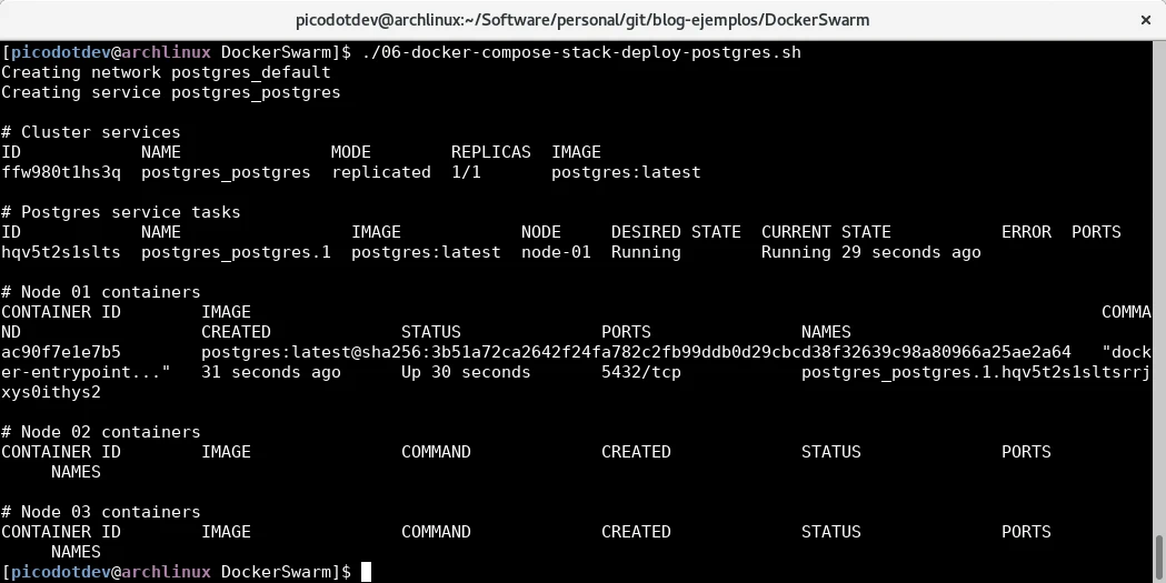 En la siguiente captura de pantalla se observa en que nodo ha sido iniciado el contenedor de postgres y que identificativo se le ha asignado.