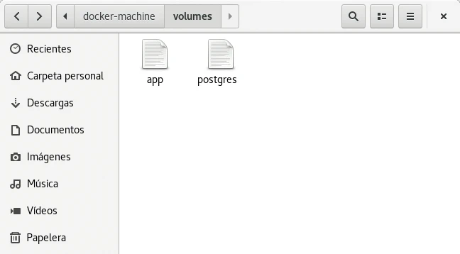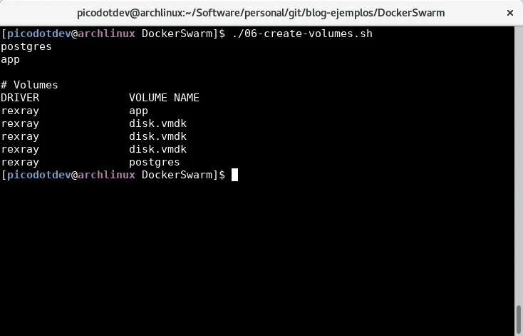 En el stack el volumen de datos postgres está declarado y creado de forma externa. Usando VirtualBox con REX-Ray en el host o anfitrión se crea un archivo que contiene los datos del volumen. Al listar los volúmenes de datos además de los creados postgres y app están los de los discos duros de cada uno de los nodos identificados como disk.vmdk. El parámetro opt=size=5 indica que el volumen de datos es de una tamaño de 5GiB.