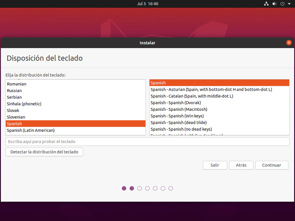 Pasos en los que solicitan unos pocos datos como el idioma, la disposición del teclado, tipo de instalación, ubicación y el usuario y contraseña de inicio de sesión.