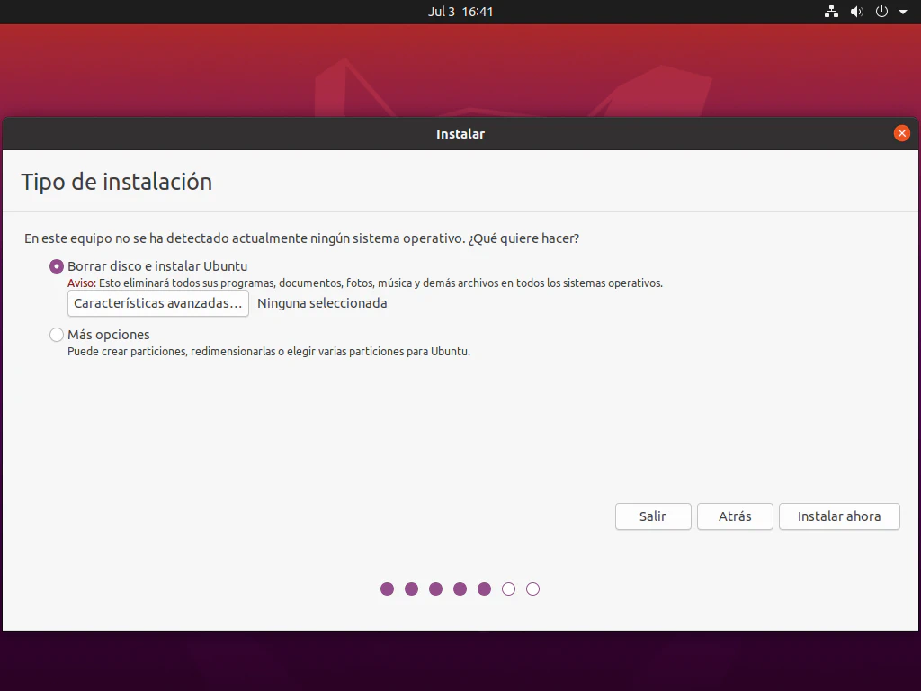 - Una confirmación para proceder a borrar el disco duro e iniciar la instalación.
