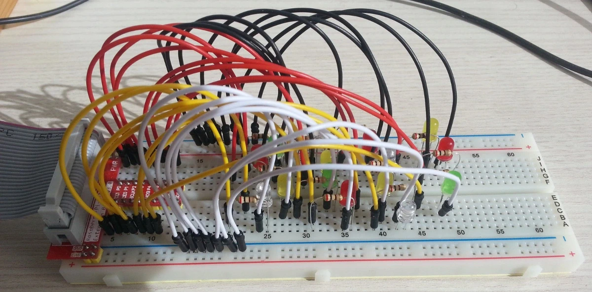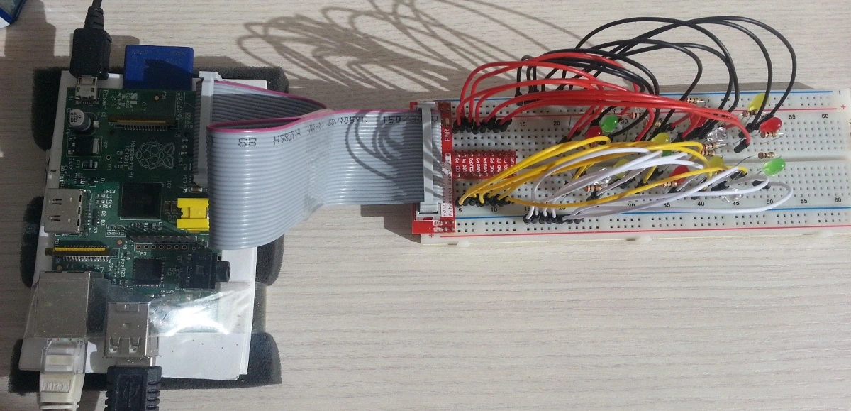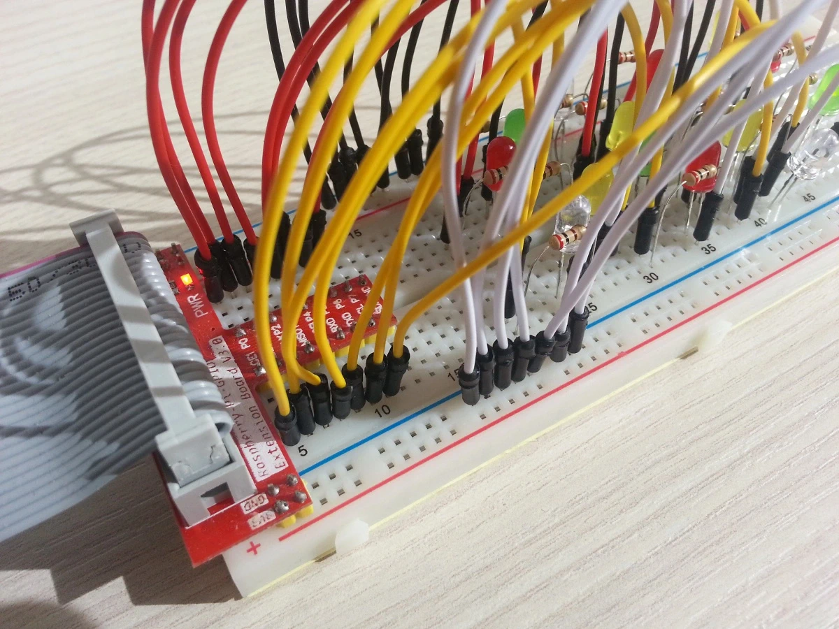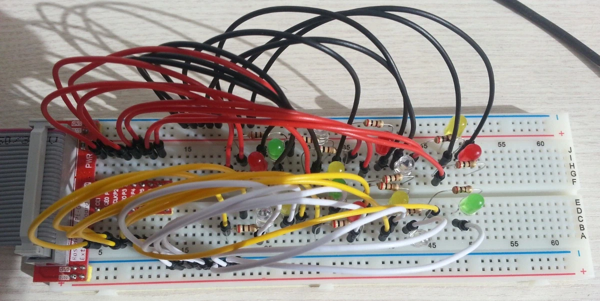 Esta es la foto del cableado usando múltiples cables macho-macho para conectar los pines con el polo positivo de los diodos pasando por la resistencia y también múltiples cables para conectar el polo negativo del diodo con tierra. Usando una placa breadboard para realizar las conexiones sin soldadura y una placa de extensión wiringPi para conectar la Raspberry Pi con la placa breadboard con un cable de 26 pines en mi caso por el modelo que tengo de RPi este es el aspecto de cableado.