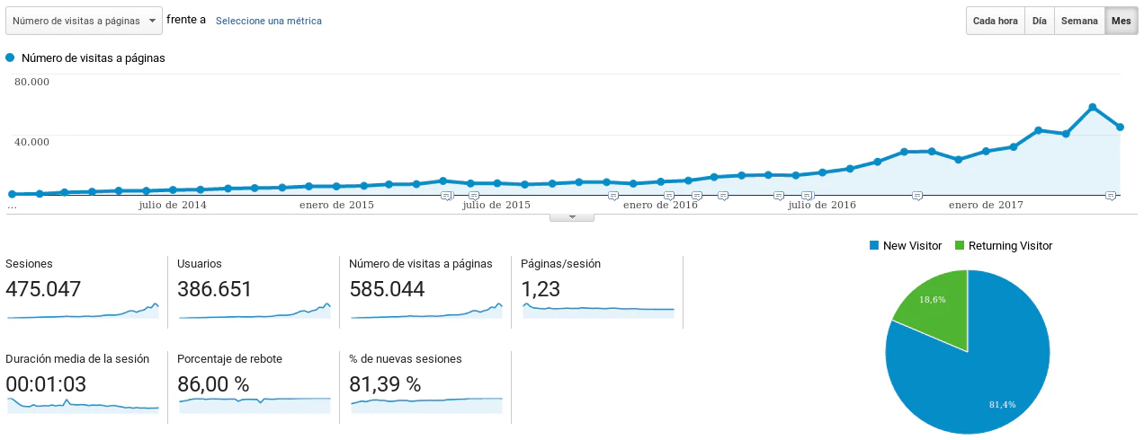 Más del 90% del tráfico que recibo proviene del buscador Google y el resto de tráfico directo o de referencia. Solo unos 5 artículos son los que reciben la mayor parte de las visitas y que intento aprovechar para que los usuarios accedan a otros artículos relacionados. El aumento de visitas se debe a que con el paso del tiempo habré posicionado mejor algunos artículos en Google y en menor medida a los nuevos que he publicado. A Google creo que le gustan los sitios que publican nuevo contenido con asiduidad y regularmente en primera instancia y en medida similar si es de calidad. De enero de 2014 a enero de 2016 el crecimiento parece plano pero también fue constante aunque simplemente se ve enmascarado por el de los últimos meses.