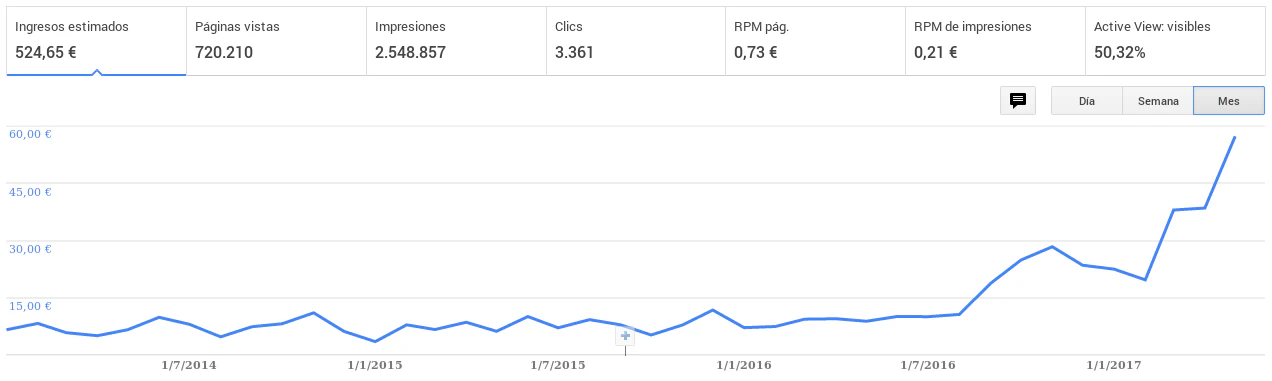 El número de visitas ha aumentado notablemente de unas 9K páginas vistas en enero de 2016 a unas 30K en enero de 2017 y ahora a finales de junio unas 60K. Solamente en estos seis primeros meses ya he duplicado el tráfico mayoritariamente proveniente del buscador Google. Los ingresos por AdSense también han aumentado notablemente de 15 € pasando a 50 € mensuales con los que ahora cada dos meses recibo una transferencia de Google en mi cuenta corriente lo que empieza a ser una cantidad respetable aunque no compense por ello solamente la dedicación que requiere.