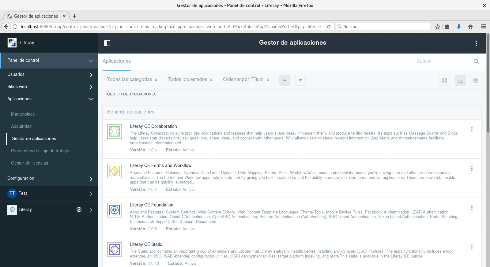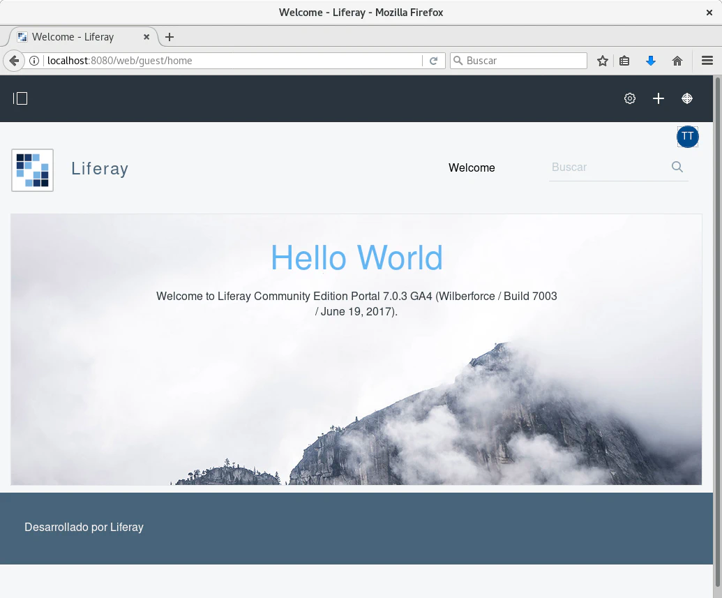 Desde la página de descargas se puede obtener la edición para la comunidad de Liferay además de otros productos eligiendo la versión deseada y en la red para desarrolladores obtener documentación y material de referencia. Una vez descargado el archivo de la distribución de Liferay y descomprimido se inicia con el comando ubicado en tomcat-8.0.32/bin/startup.sh. En el archivo tomcat-8.0.32logs/catalina.out se emiten las trazas y mensajes del servidor. Iniciado Liferay se presenta una página de configuración, se han de aceptar los términos y condiciones e iniciar sesión con el usuario creado en la primera página de configuración.