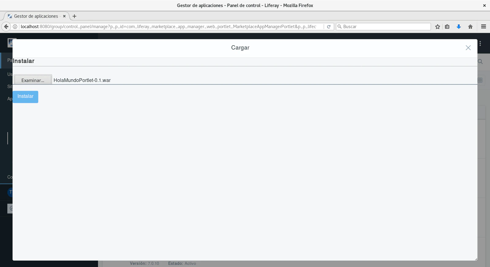 Para añadir un portlet propio a Liferay hay que acceder al Panel de control > Aplicaciones > Gestor de aplicaciones y pulsar la opción cargar ubicada en la parte superior derecha de la página. En la salida del servidor aparecerán varias trazas relativas al despliegue del portlet.