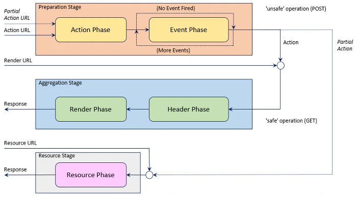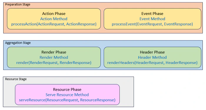 Para cada una de estas fases en la API de los portlets hay un método específico que son processAction, procesEvent, renderHeaders y render. Los portlets poseen modos que se visualizan con los métodos doEdit, doHelp y doView o el correspondiente anotado con @RenderMode. Cada uno de esos métodos para cada una de las fases reciben dos parámetros uno que representa a la petición que heredan de PortletRequest y son ActionRequest, ClientDataRequest, EventRequest, HeaderRequest, RenderRequest y ResourceRequest. Los objetos que representan a las respuestas heredan de PortletResponse y son ActionResponse, EventResponse, HeaderResponse, MimeResponse, RenderResponse, ResourceResponse y StateAwareResponse.