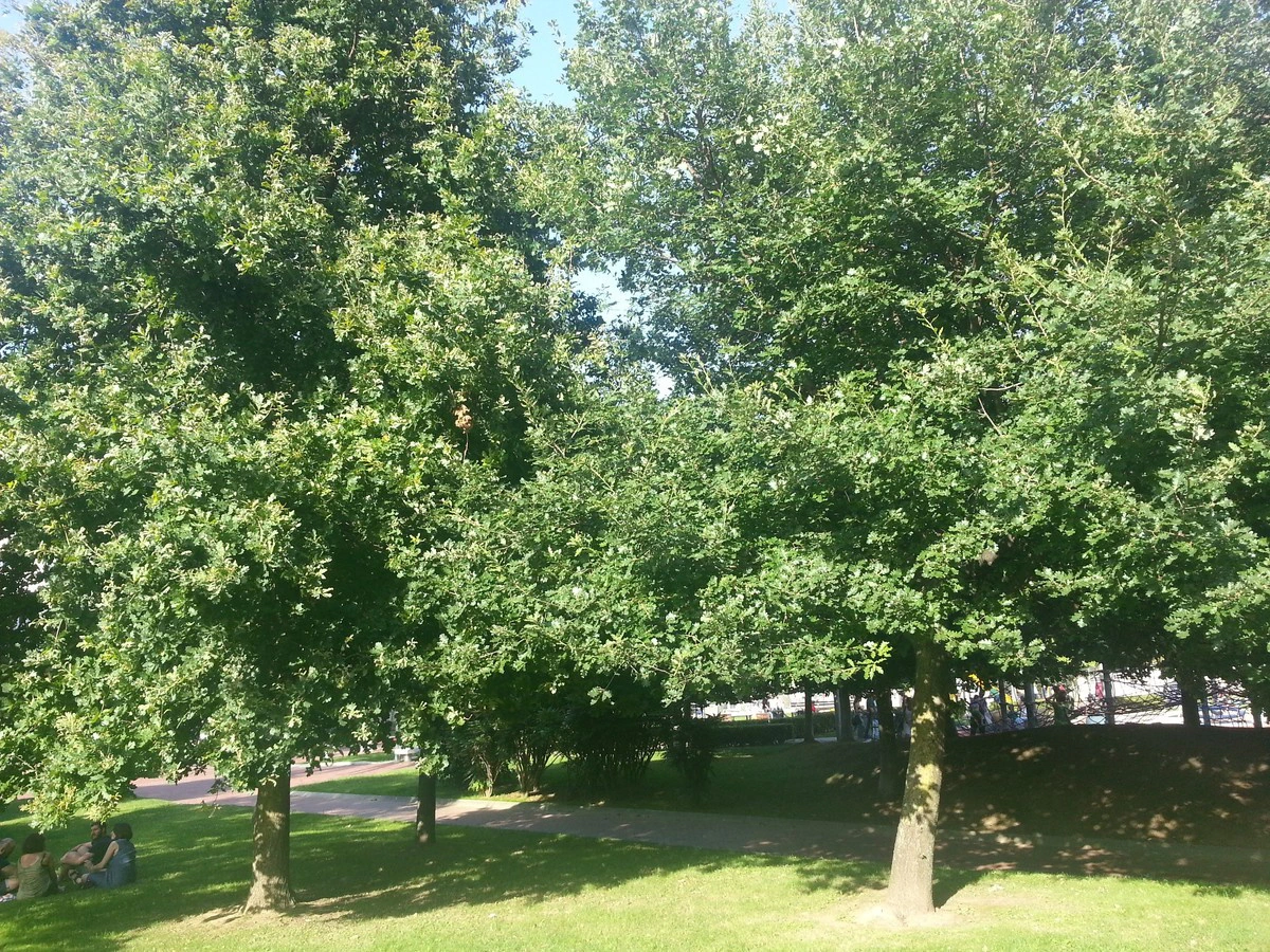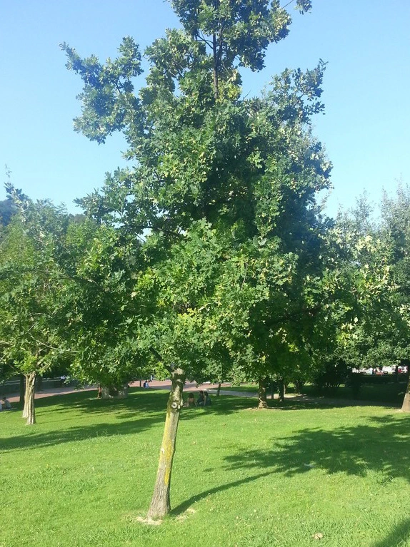 Puesto a buscar ejemplares de esta especie de árbol desde hace unos días he empezado a fijarme si alguno de los árboles con los que me voy cruzando es un roble común. Hay muchos árboles en la aceras y zonas ajardinadas, muchos aún no se identificar de qué especie pero los robles son fáciles de identificar por sus hojas lobuladas y estos por el momento son los que me interesan.
