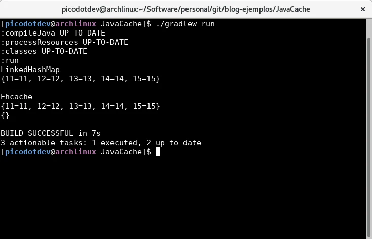 En el ejemplo se crea una cache que tiene como máximo 5 elementos y se insertan en ella 15, cuando se intenta insertar en elemento más de la capacidad máxima el elemento más viejo se elimina de modo que la cache siempre tiene como máximo 5 elementos. Si la cache va a ser accedida tanto para operaciones de lectura como de escritura desde múltiples threads hay que prevenir posibles problemas de concurrencia sincronizando su acceso con el método Collections.synchronizedMap.