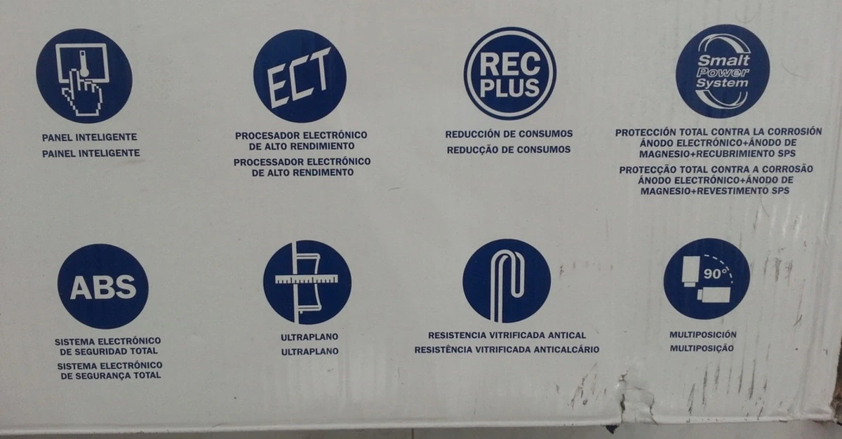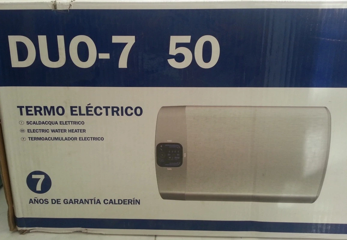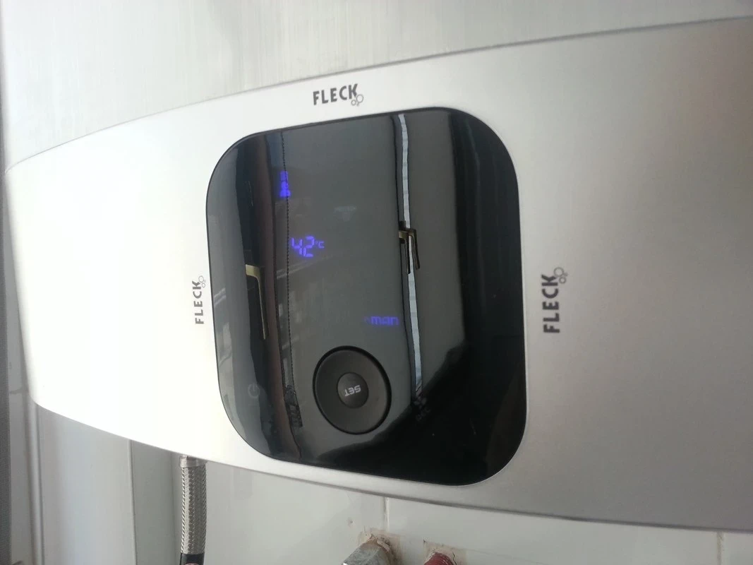 Finalmente me decidí por el termo Fleck Duo 7 50 es un termo de gama alta y su precio es de los más altos entre los modelos de termos con la misma capacidad pero su precio como comentaba anteriormente es muy inferior a cualquier modelo de caldera. Donde vivo el agua es de buena calidad y blanda con lo que las resistencias no lo he considerado muy importante que estuviesen envainadas. El display es bastante bueno pudiendo elegir la temperatura del agua, informa del tiempo restante hasta alcanzarla y la temperatura del agua actual. Este modelo de termo eléctrico una de las varias cosas buenas que tiene es que es muy plano tiendo únicamente 27 centímetros de fondo con lo que es posible ganar un espacio que antes estaba ocupado por la caldera como ha sido en mi caso. Se puede colocar tanto en posición vertical como horizontal. Posee ánodo electrónico así como también ánodos de magnesio, función antilegionela, antihelada, un display digital que indica el tiempo restante hasta alcanzar la temperatura programada y la temperatura actual, función de ahorro de energía según hábitos de uso y dos depósitos independientes para mayor eficiencia calificada como B. Los controles son táctiles, intuitivos y con la rueda circular se controla la temperatura.