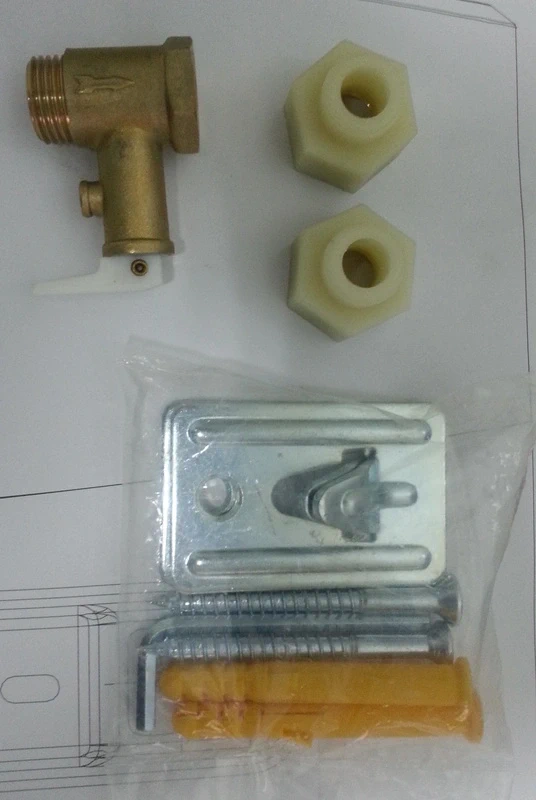 Incluye dos tacos y tornillos de unos 8 centímetros de largo y 8 milímetros de diámetro y una plantilla de montaje que tiene el tamaño real del termo para calcular la posición deseada antes de taladrar la pared. Los tacos incluidos en la caja no son muy buenos y cuando los puse los anclajes quedaban algo separados de la pared. Al final en vez de usar los tacos incluidos use un taco químico y unas varillas roscadas de 10mm para anclar los soportes y colgar el termo. Con las varillas, taco químico, roscas y arandelas el termo queda mejor asegurado. Al ser el termo bastante plano la carga que ejerce sobre la pared es más vertical.
