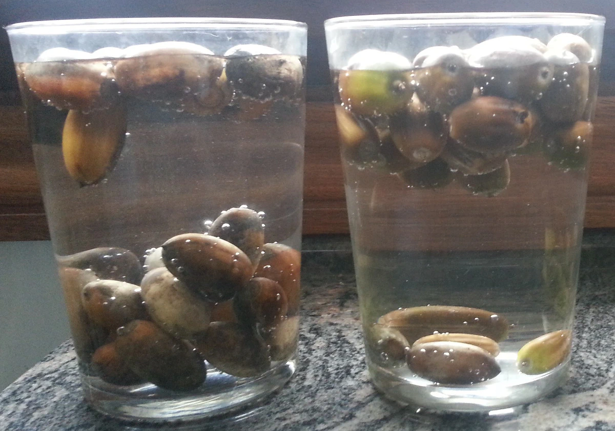 Para obtener una mayor tasa de éxito en la germinación hay que averiguar cuales de las semillas son viables. En el caso de las semillas o bellotas de roble común las viables son aquellas que sumergiéndolas en agua no flotan, en la foto izquierda no hay ninguna que flote ya que estas las he recogido en la temporada en curso pero en la de la derecha si hay algunas que flotan por ser de alguna temporada anterior y aunque tenga el color adecuado se consideran no viables y aptas para germinar ya que muy posiblemente tengan algún tipo de podredumbre. Las que flotan están vacías o podridas y no es probable que germinen por lo que se tiran a la basura directamente. En la recolección las mejores semillas son aquellas con color parduzco, con cierto brillo al limpiarlas, que apretándola no ceda y que tengan el mayor tamaño de las que encontremos.