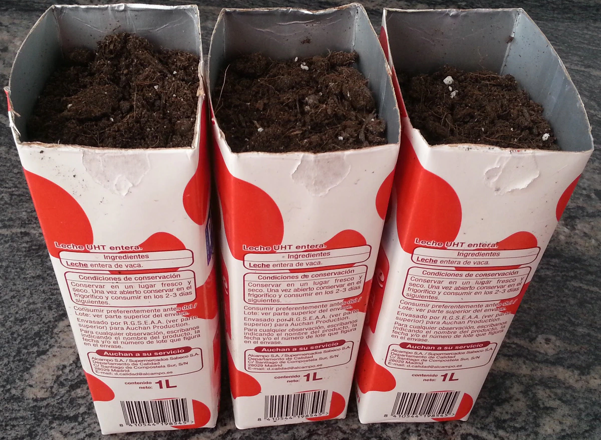 Como recipiente para plantar las semillas en el caso de los robles comunes es recomendable un tiesto que tenga cierta profundidad ya que estos poseen unas raíces largas que durante sus primeros meses y años se dedican a hacerlas crecer más que a crecer el tallo o las hojas. En mi caso usaré cartones de leche recortados por la parte superior, con una altura para las raíces de unos 12 centímetros y con unos agujeros en la parte inferior para que el agua al regarlas drene y las raíces no se pudran con la acumulación de agua. Para que la tierra no se salga por los agujeros inferiores he puesto un trozo de papel de cocina en la parte de abajo.