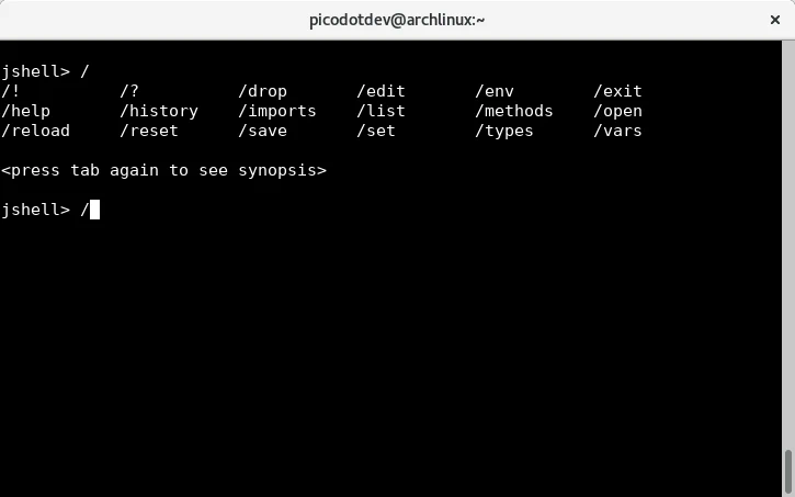 Para diferenciar las expresiones de código de los comandos estos últimos son precedidos por el caracter /. Hay varios como los ya citados para listar los snippets de código y salir de jshell, otros son para listar las definiciones de variables con /vars, métodos con /methods, tipos con /types e imports con /imports. La lista completa de comandos puede obtenerse pulsando la tecla tabulador después de la barra de comando.
