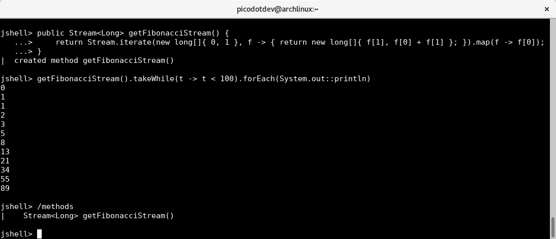 Se pueden crear clases y métodos como en el ejemplo de la serie de Fibonacci implementada con un Stream de la cual se muestran los elementos de la serie menores que el número 100.